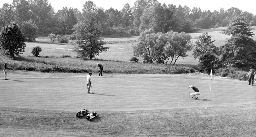 The serene feeling extends into. Jim Reynolds removes turf from edge of 8th green. The Richmond-areas oldest public golf course prepares for its final round.